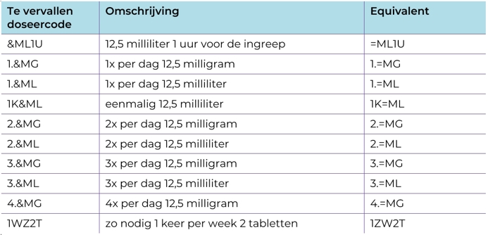 De genoemde codes worden bij nieuwe voorschriften vervangen door de equivalente doseercode wanneer u deze intypt tijdens het voorschrijven of de receptverwerking. Enige overlast bij herhaalreceptuur en de aanschrijfbuffer is echter niet te voorkomen, hierbij zal handmatig de equivalente code ingegeven moeten worden. Ook BOS/MBJ-signalen kunnen hierdoor ont-onderdrukt worden. Vanwege deze overlast wordt zeer spaarzaam omgegaan met het laten vervallen van doseercodes.
